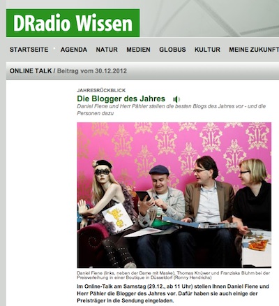 ... im Radio. Oja. Denn als wäre der Dezember nicht schon aufregend genug gewesen, wurde ich heute im OnlineTalk von DRadio Wissen/Deutschlandfunk als äh "Modebloggerin 2012" interviewt. Nicht nur ich natürlich, sondern auch alle anderen "Blogger 2012". Spannend war das und interessant die Stimmen hinter den Blogs zu hören.
