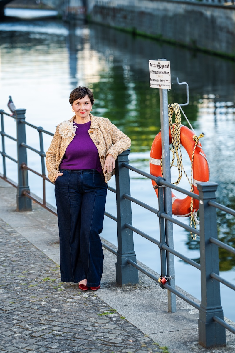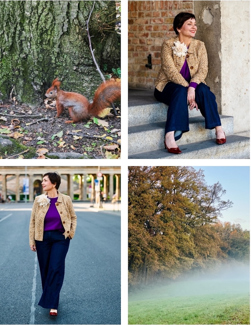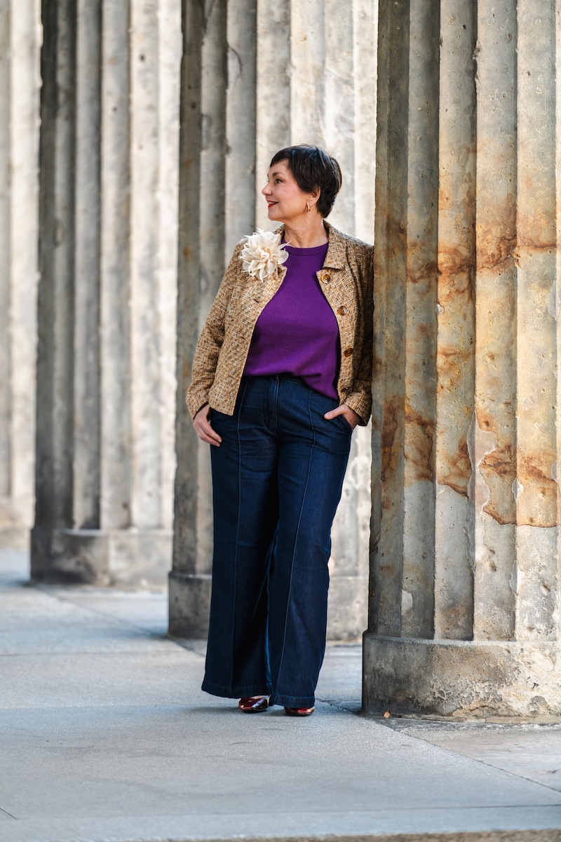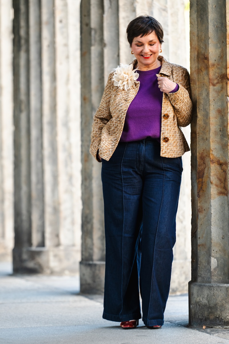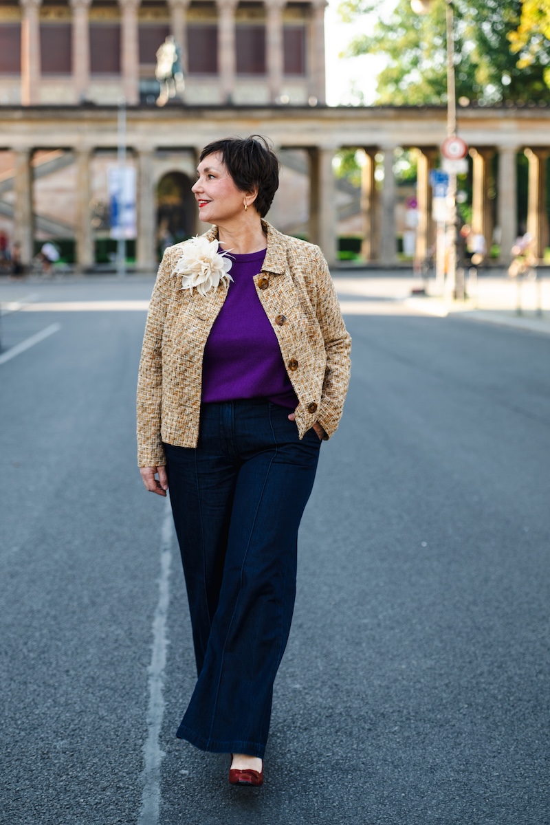 Zum Start in den Herbst gibt es einen Look, an dem so gar nichts „typisch Texterella“ ist. Kein Rot, kein Pink, keine Taille, kein einziger Streifen, nicht mal ein Nickituch – stattdessen Lila, eine kastige Boucléjacke in Beige und eine Jeans mit weitem Bein, statt dem üblichen engen Schnitt! Und der Höhepunkt: Pumps! PUMPS! Du liebe Güte, solche Schuhe hatte ich ja schon seit Jahren nicht mehr an! Erfreulicherweise bin ich beim Shooting weder umgeknickt noch habe ich mir gleich den Knöchel gebrochen! Und die Schuhe waren sogar bequem! Ehrlich, ich war überrascht!