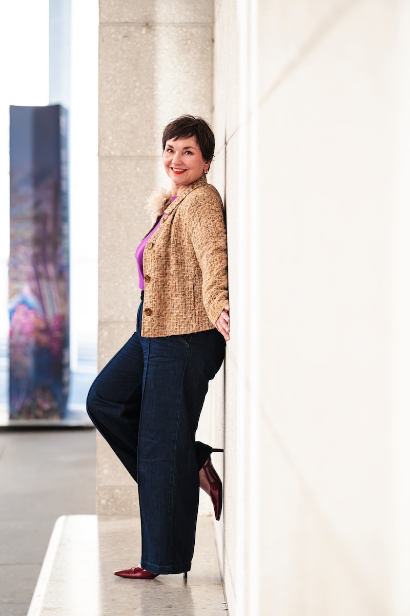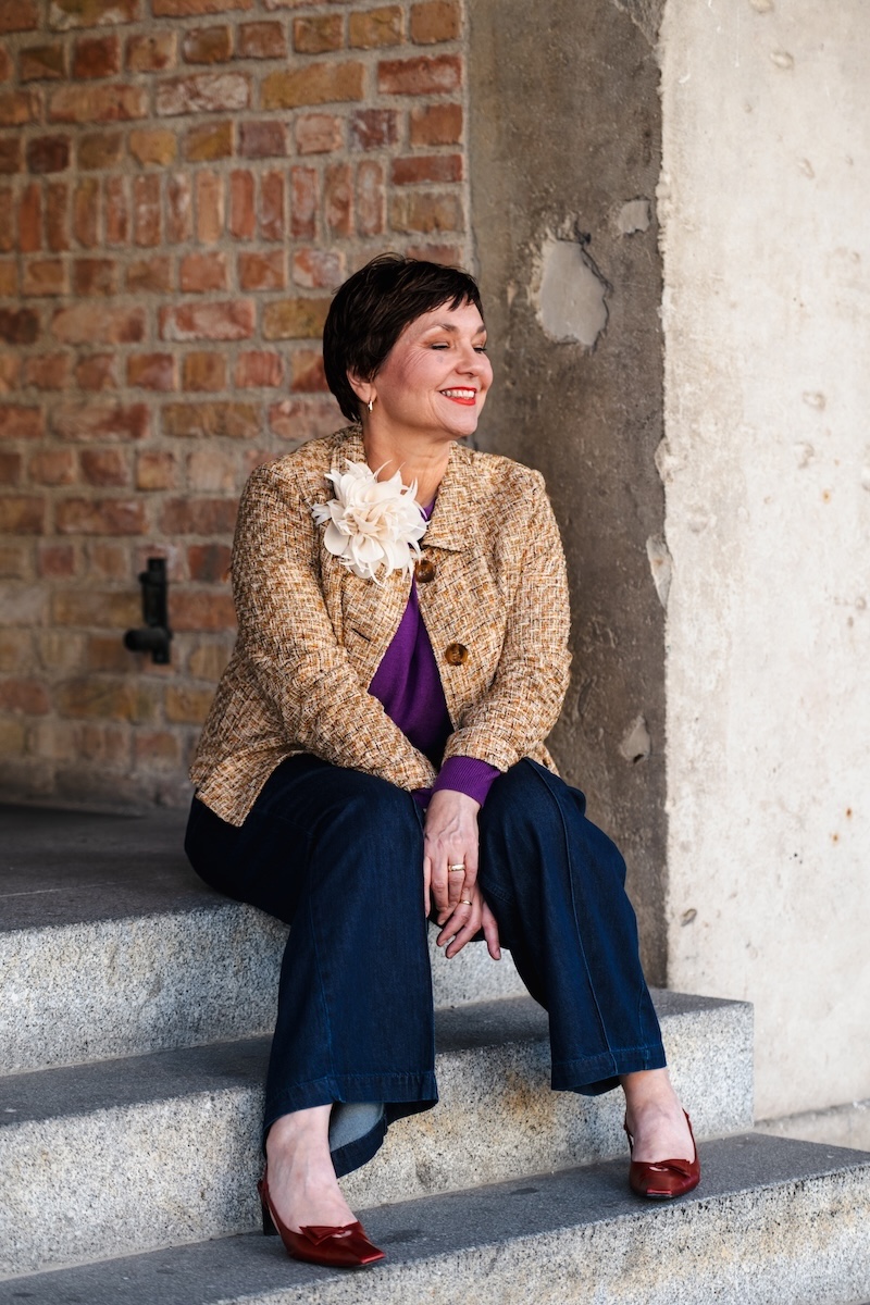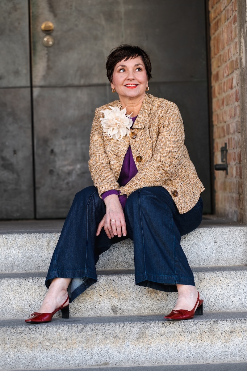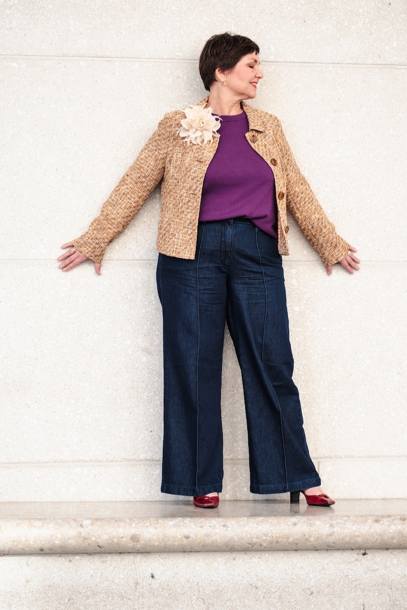 Zum Start in den Herbst gibt es einen Look, an dem so gar nichts „typisch Texterella“ ist. Kein Rot, kein Pink, keine Taille, kein einziger Streifen, nicht mal ein Nickituch – stattdessen Lila, eine kastige Boucléjacke in Beige und eine Jeans mit weitem Bein, statt dem üblichen engen Schnitt! Und der Höhepunkt: Pumps! PUMPS! Du liebe Güte, solche Schuhe hatte ich ja schon seit Jahren nicht mehr an! Erfreulicherweise bin ich beim Shooting weder umgeknickt noch habe ich mir gleich den Knöchel gebrochen! Und die Schuhe waren sogar bequem! Ehrlich, ich war überrascht!