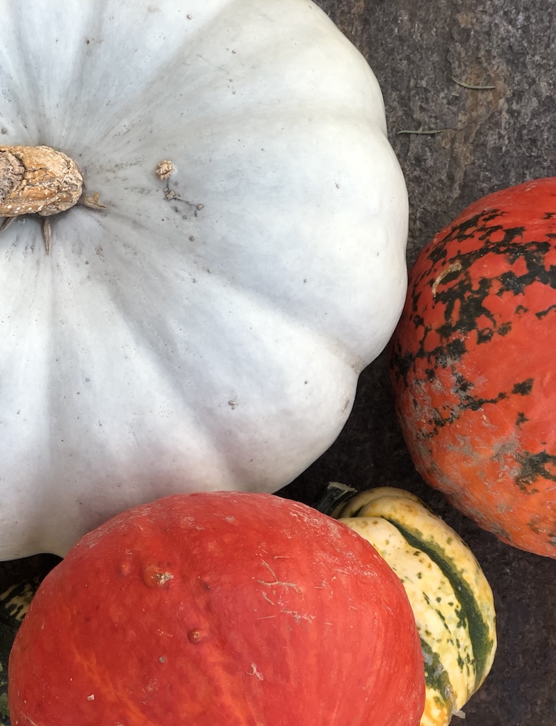 Jetzt beginnt die Zeit der Eintöpfe, Pilzgerichte und Kürbisse. Zwei stehen schon auf der Anrichte.