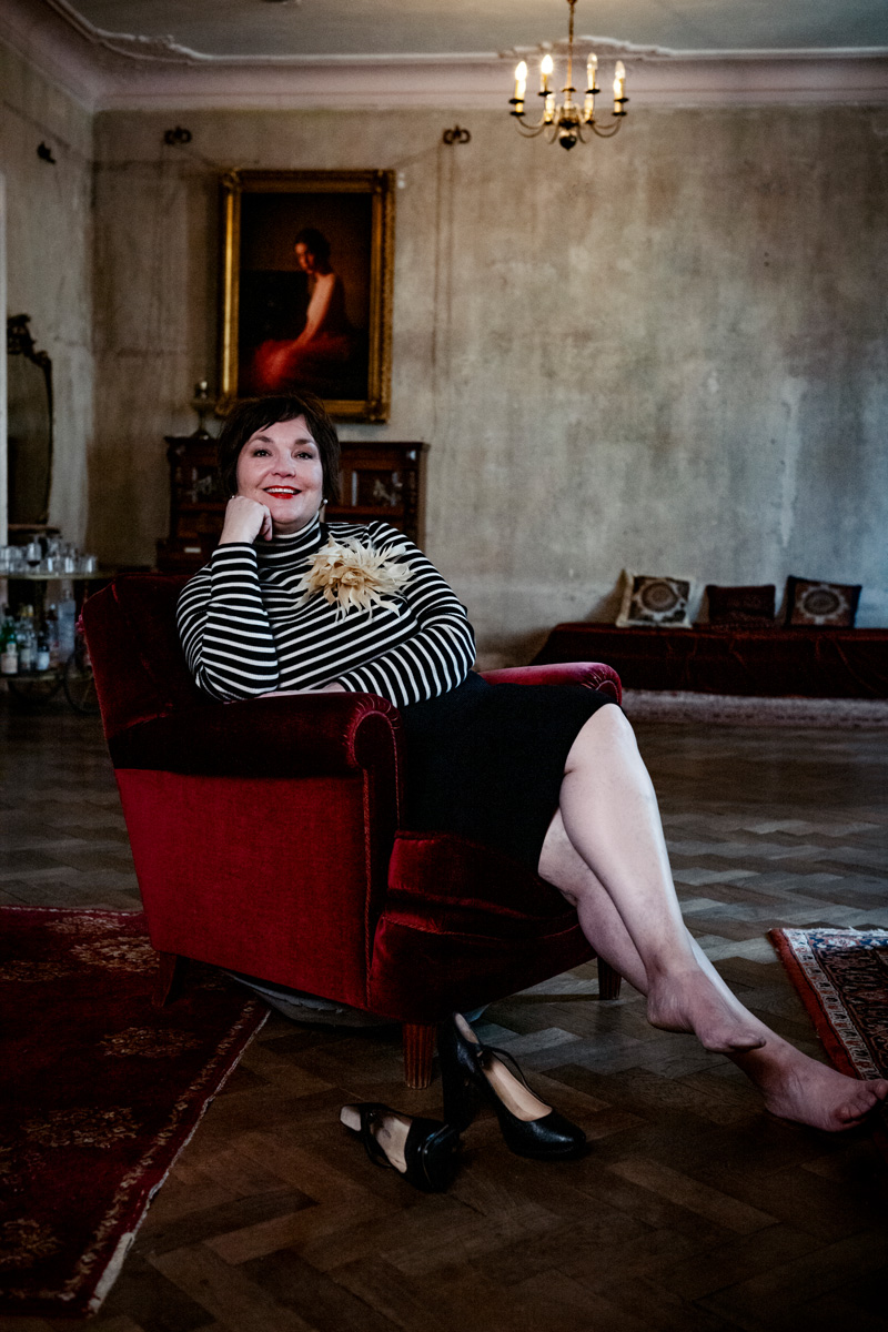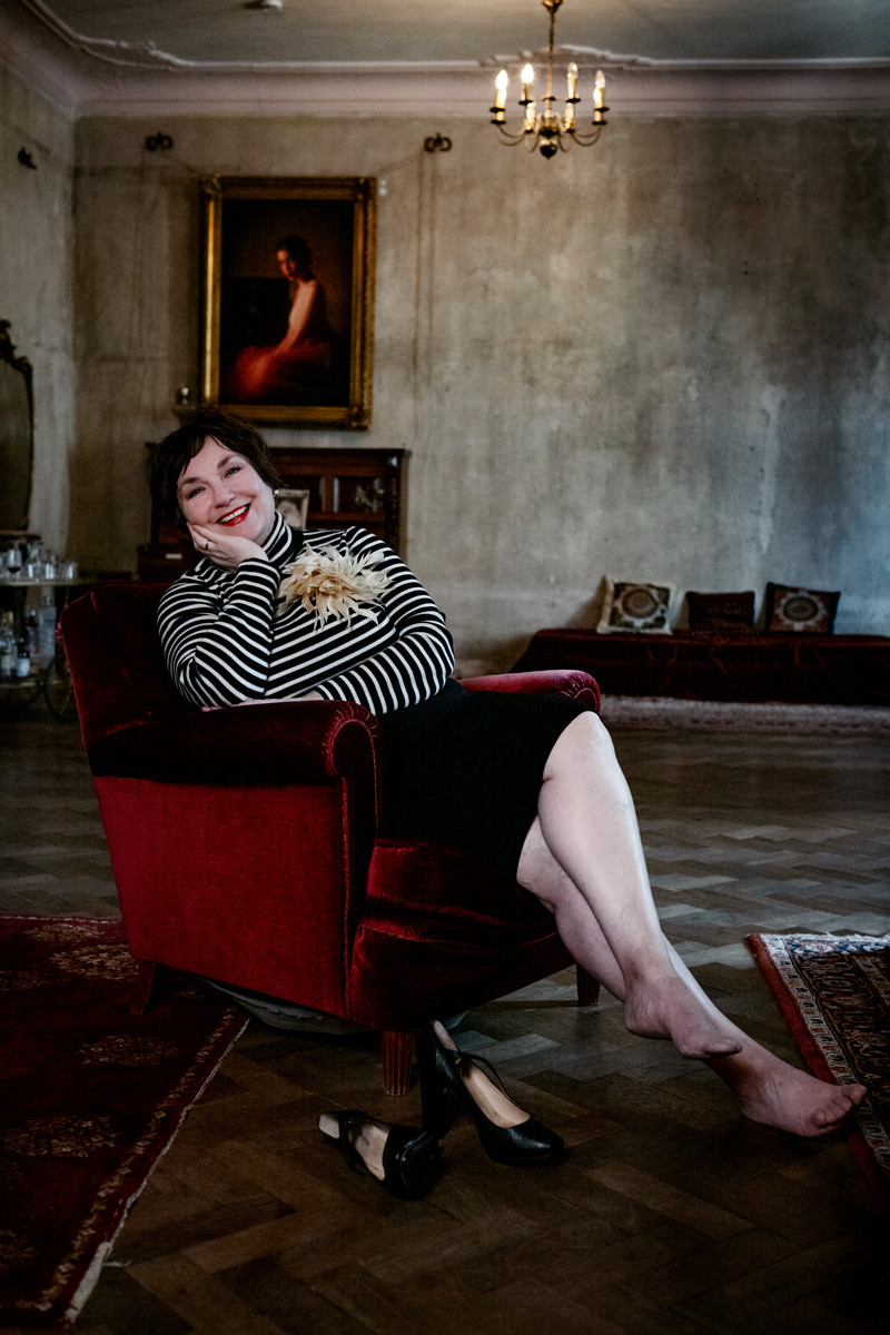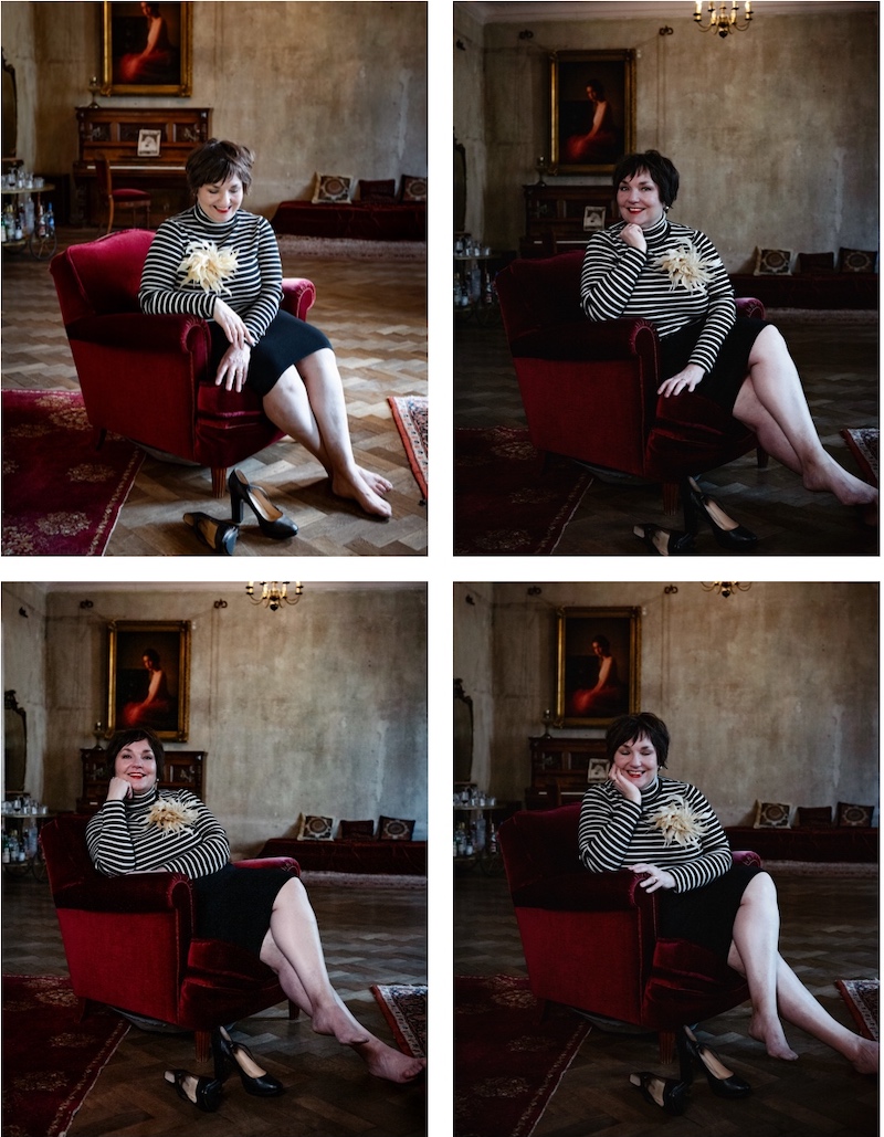 Was für eine schöne Bildkomposition. Dieser Raum mit dem roten Sessel, das gedämpfte Licht und Texterella wie hingegossen ohne Schuhe. Wunderbar….