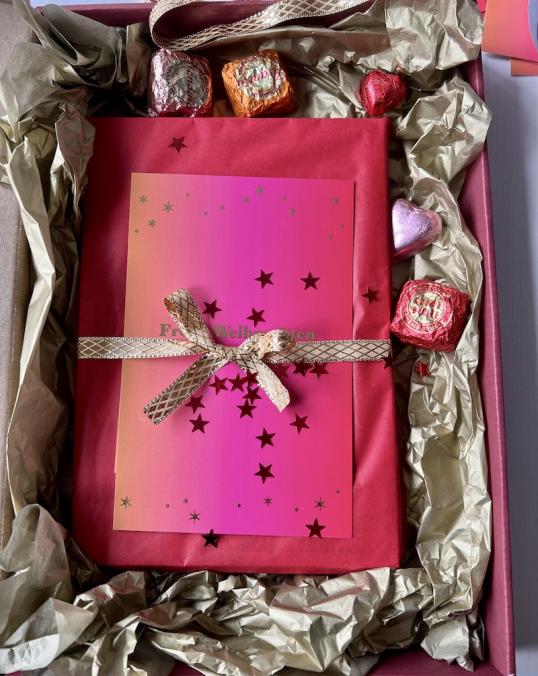 Und so verbrachte ich die letzten Tage in einer Wolke aus goldenem Seidenpapier und güldenen Schleifchen, befüllte emsig weihnachtsrote Kartons mit signierten Büchern und italienischen Pralinen in glänzendem Stanniolpapier und streute Sternchen über alles, bevor ich das Paket verschloss. Es hätte nur noch Rolf Zuckowski mit „In der Weihnachtspackerei“ im Radio gefehlt … Und auch wenn ich beim Ausfüllen des Formulars für die Onlinefrankierung gelegentlich genervt seufzte, weil … ach, lassen wir das ..., so war ich doch gleichzeitig beseelt von dem Gedanken, dass so viele tolle Frauen ihren besten und ältesten Freundinnen (oder auch sich selbst) dieses – mein! – Buch „Auf das Leben!“ unter den Weihnachtsbaum legen wollen. Was für eine Ehre! Danke dafür.