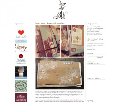 Es gibt so viele unglaublich schöne Blogs - aber Oh Joy! gehört für mich zu den allerschönsten! Kein Wunder, denn auch in diesem Blog geht es um die schönen Dinge ... Ein bisschen ein amerikanisches Pendant zur Texteralla also, wenn gleich mit deutlich mehr Lesern (allein bei Bloglines werden über 1.660 Abonnenten gelistet. Nunja, auch Texterella braucht ja Ziele! :-))
